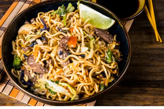 Crunchy carrots, peppers, and spring onions add freshness and colour, making each plate vibrant and wholesome. The stir-frying process ensures every ingredient retains its character while uniting under the bold flavours of soy, garlic, and spices.