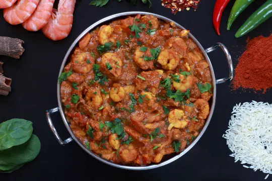 The masala is made with onions, tomatoes, ginger, garlic, and a medley of freshly ground spices such as coriander, chilli, cumin, and garam masala. Slow-cooked to perfection, it forms a thick, flavourful base that coats each prawn beautifully.